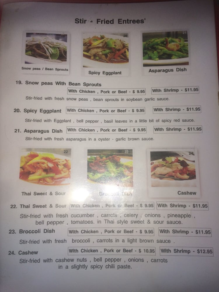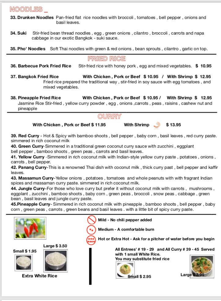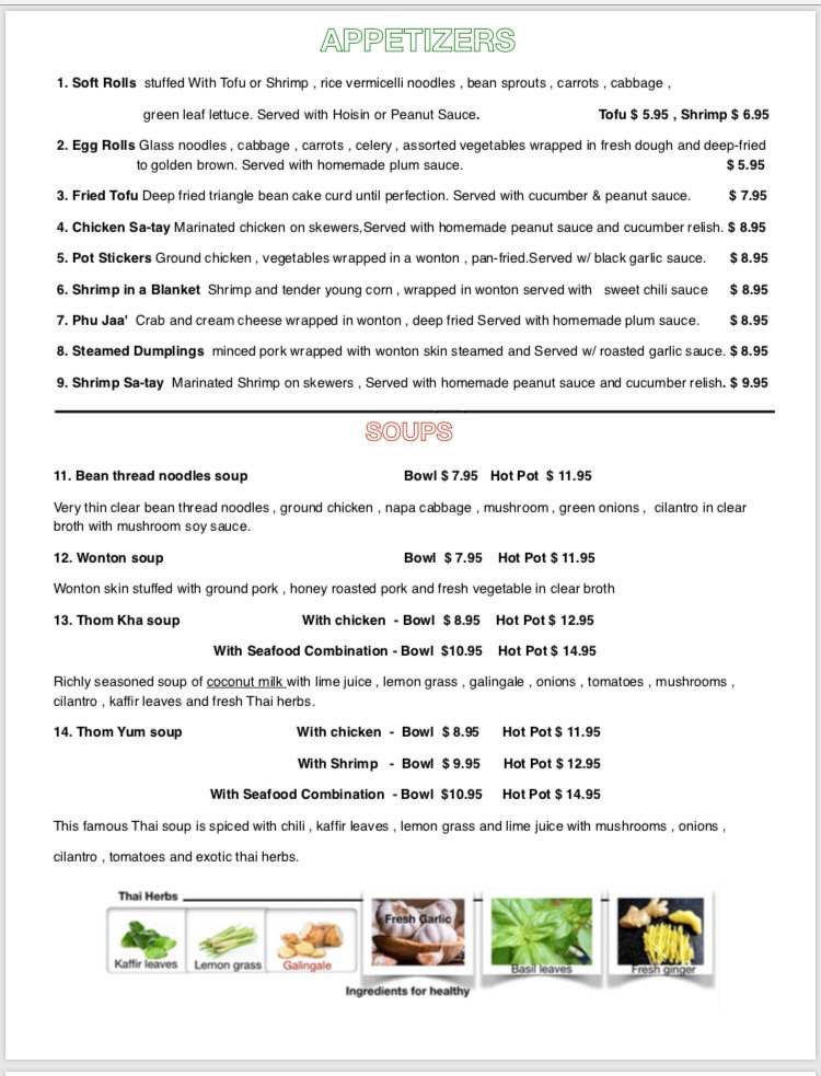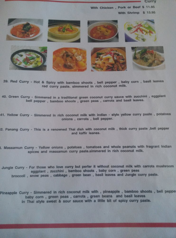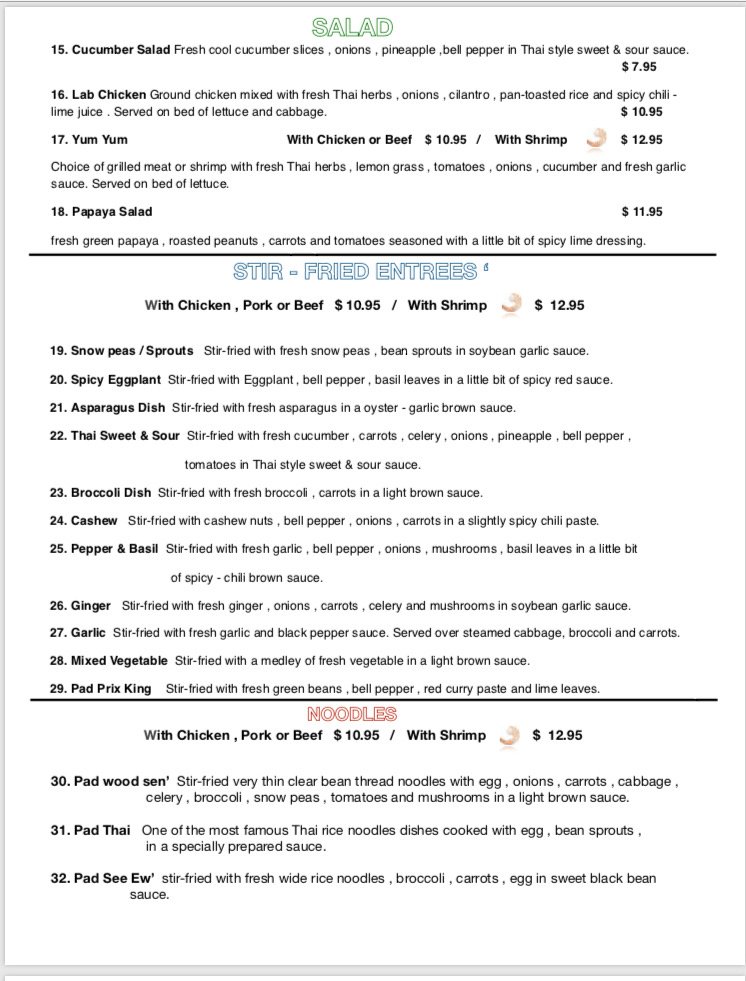 The menu also boasts flavorful options like Lab Chicken, a harmonious mix of ground chicken and Thai herbs, and the beloved Yum YumJungle Curry and Massamun Curry with coconut milk provide a delectable experience.